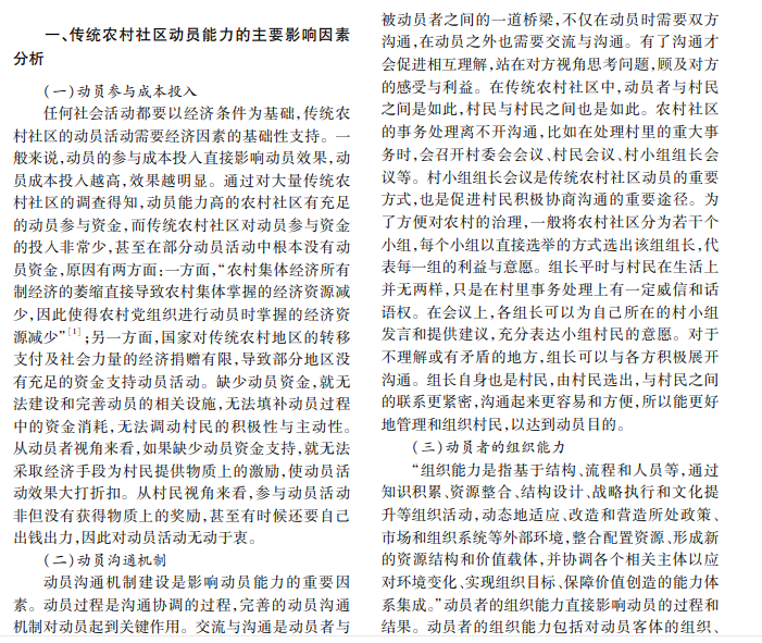 为巩固脱贫攻坚成果,推进农村地区现代化发展,国家提出乡村振兴战略,对传统农村社区动员能 力提出了更高、更新的要求。本文以乡村振兴战略为背景,以动员能力为视角,以传统农村社区为研究对象,基 于大量农村事实分析,探究影响动员能力提升的因素,指出动员能力提升存在问题的原因和困境及优化路径。