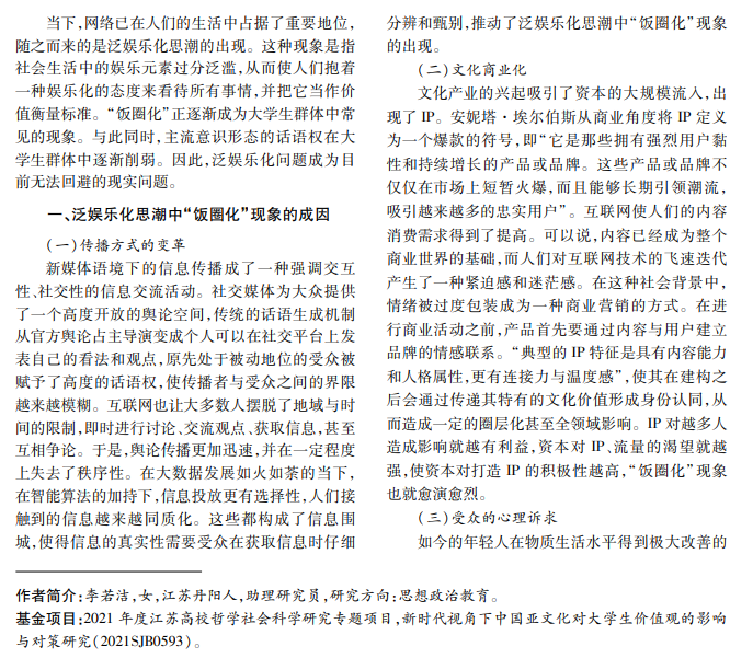 泛娱乐化思潮逐渐在网络发展大环境中崛起,大学生在泛娱乐化思潮中受到波及。本文主要厘清 泛娱乐化思潮中“饭圈化”现象的成因及其对大学生的影响,并在此基础上提出对大学生思想政治教育进行引 导的路径,引导大学生逐步建构价值认同、树立科学理性的娱乐观念。