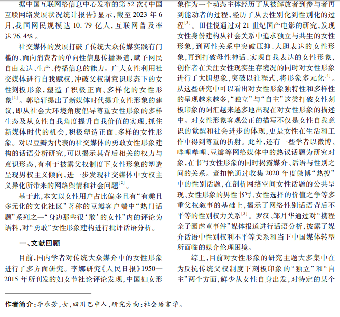 本文从批评话语分析视角,以豆瓣热门话题评论为语料,基于 Fairclough三维分析模式理论框架, 探究勇敢女性形象背后的社会问题。研究发现:以豆瓣为代表的社交媒体中,勇敢女性的特征主要有自我主体 化和多元化两个特点;勇敢女性形象的标准受到男权制度的制约,以及女权主义异化带来了网络舆论主体失范 和性别对立的社会问题。