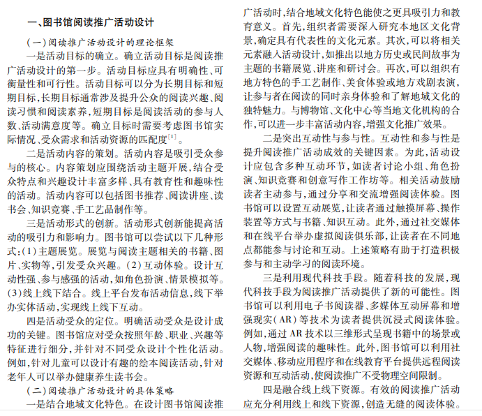 本文探讨图书馆阅读推广活动设计与评估,明确图书馆角色,构建理论框架。通过案例分析展示 活动特点与成效,在此基础上提出改进措施,展望发展趋势,指出成功活动需目标明确、内容丰富、形式多样,强 调融合线上线下资源、创新及深入挖掘用户需求的重要性。
