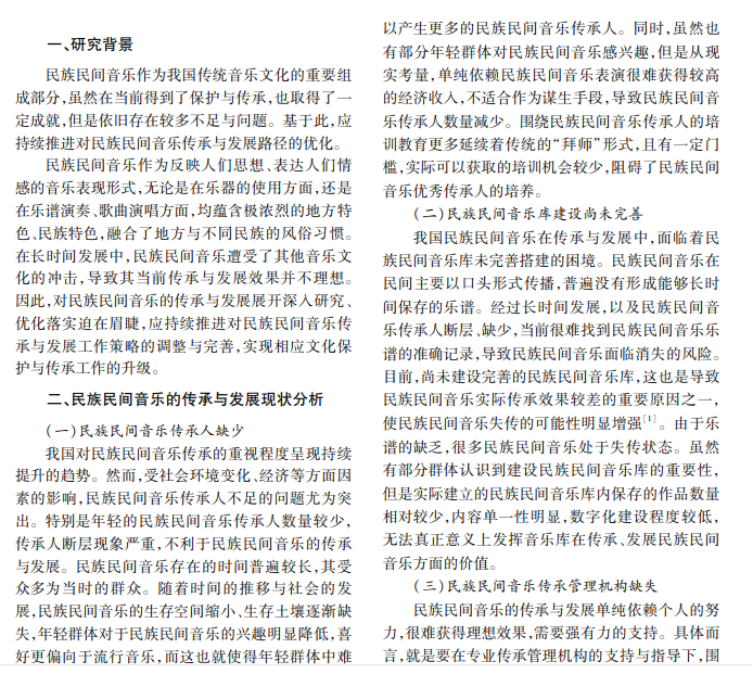 本文通过分析民族民间音乐的传承与发展现状,总结民族民间音乐传承与发展过程中存在的问题 与不足,针对性提出优化民族民间音乐传承工作的具体策略,旨在更好地保护与传承民族民间音乐。