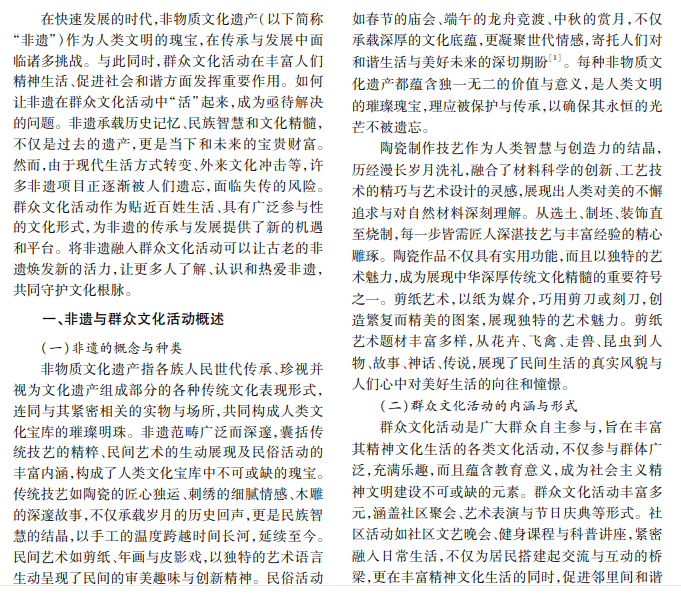 近年来,山东省临沂市莒南县积极推进“非遗 +”工作模式,持续深入挖掘非遗资源,不断提升非遗 项目的影响力和传播力,通过开展丰富多彩的群众文化活动,让非遗项目在群众中得到传承和发扬,让非遗成 为老百姓生活中不可或缺的一部分。基于此,本文分析非遗在群众文化活动中的应用。