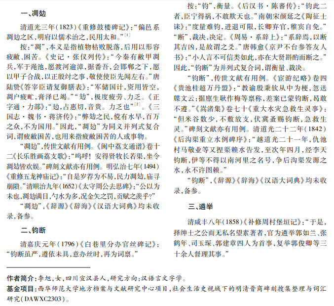 清代晋商碑刻真实记录了晋商在清代发展到鼎盛的历史,反映了晋商的贸易活动、行业规约、建筑 群落、思想信仰等内容,具有重要的研究价值。然而,其中部分词语较为晦涩,为正确释读文本及深入研究带来 了困扰。本文选择清代晋商碑刻中的七个词语进行考释,通过分析文意,探究词语结构,举证传世文献与出土 文献,并旁及相关词条,以期提供准确释义,为辞书编纂及修订提供参考。