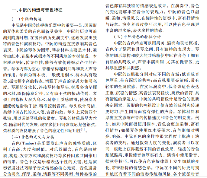 本文介绍中阮的基本构造与材质及其对音色表现的影响,阐述音色的定义与分类,分析中阮演奏 技巧及其对音色变化的作用,尤其是力度、手指位置、拨弦角度及修饰性技巧(如滑音和揉弦)对音色层次和表 现力的影响,最后对比传统演奏风格与现代演奏风格,探讨中阮演奏技巧对音色多样性的丰富表现。