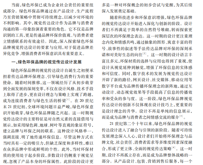 随着全球环保意识的觉醒,绿色环保品牌在市场中的地位日益显著。本文旨在深入分析绿色环保 品牌视觉传达设计的要素,探讨其在设计发展、特征体现及实际应用方面的策略与效果,剖析视觉传达设计如 何成为绿色环保品牌与消费者之间沟通的桥梁,从而促进绿色消费行为形成。