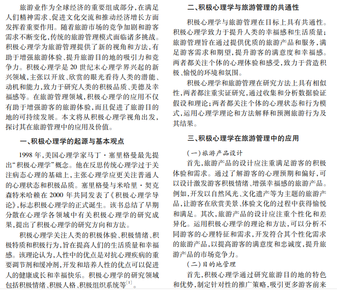 20世纪 90年代,积极心理学逐渐兴起,其关注人类积极品质,为旅游管理提供了新的视角和方法。 本文阐述积极心理学的起源、背景及基本观点,分析积极心理学与旅游管理的共通性,探讨积极心理学在旅游 管理中的应用领域,最后总结积极心理学在旅游管理中的应用效果,提出未来研究方向。