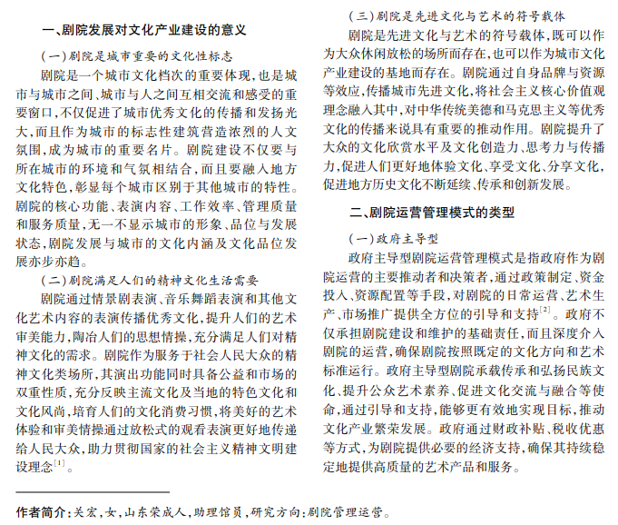 剧院是城市重要的文化标志,也是先进文化与艺术的符号载体。当前剧院运营管理模式包括政府 主导型、市场导向型和混合型。剧院运营管理模式优化需遵循一定规律。剧院运营管理模式优化可以带动产 业链发展,提升地区文化消费水平,增加文化产业就业与税收,传承与弘扬中华优秀传统文化,培养文化人才和 稳定观众群体,通过跨界项目合作,打造跨界文化 IP,实现文化产业不断繁荣。