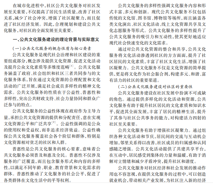 本文立足社区发展视角,着重探讨公共文化服务建设的积极作用,采用社区实地调查和定性分析 方法,梳理公共文化服务对社区发展多个维度的影响。研究发现,公共文化服务有利于提升社区居民的文化素 质,增强社区凝聚力,促进社会和谐发展。