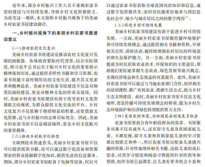 在文化层面的乡村振兴工作中,农家书屋建设属于重要内容。乡村振兴视角下的美丽乡村农家书 屋建设路径探析受到广泛关注,相关理论研究及实践探索大量涌现。基于此,本文分析乡村农家书屋的建设价 值,探讨建设策略,为农家书屋建设提供参考。