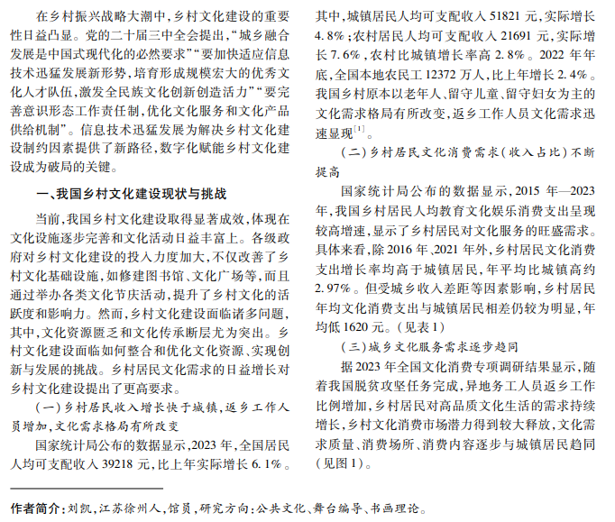 党的二十大后,城乡经济协调发展,乡村文化消费结构升级。受人口流动、老龄化、文化资源分配不 均等问题制约,乡村文化建设发展受到较大限制;居民文化需求向高品质、多样化方向转变,现有服务体系难以适 应。在此背景下,数字化赋能乡村文化建设成为关键。本文探讨利用数字技术整合乡村文化资源,增强村民文化 自觉与自信,为乡村文化传承与创新注入活力。数字化文化服务站点将成为新时代乡村文化建设的支撑点。