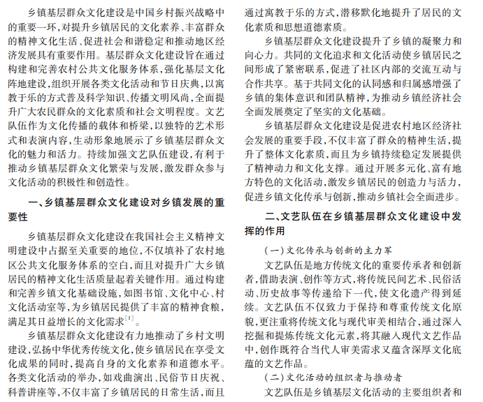 本文聚焦乡镇基层群众文化建设中文艺队伍培育方法,旨在通过文化建设与人才培养,播种文化 的“种子”,促进其开花结果,带动更多群众参与文化活动,增强群众的参与感和获得感。文章首先阐述乡镇基 层群众文化建设对乡镇发展的重要性,然后分析文艺队伍在其中的关键作用及当前培育现状,最后提出文艺队 伍的培育方法。