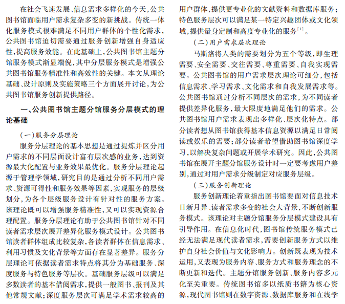 本文研究公共图书馆主题分馆服务分层模式,基于服务分层理论、用户需求层次理论和服务创新 理论,阐述服务分层的必要性与可行性,提出分层服务的原则、设计思路,从资源配置、人员培训、技术支持及评 估反馈等方面制定实施策略,旨在提升图书馆服务质量,实现服务创新,满足不同层次用户需求。