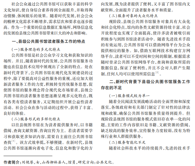公共图书馆是社会公众获取科学文化知识、提升自身综合素养、陶冶情操、休闲娱乐的重要场所, 是社会服务体系的重要构成内容。新时代背景下,网络信息化发展为各行各业带来了新的机遇与挑战,公共图 书馆也不例外。本文探究新时代背景下县级公共图书馆服务工作的特点,分析读者服务工作的不足,提出提升 县级公共图书馆读者服务水平的创新策略。