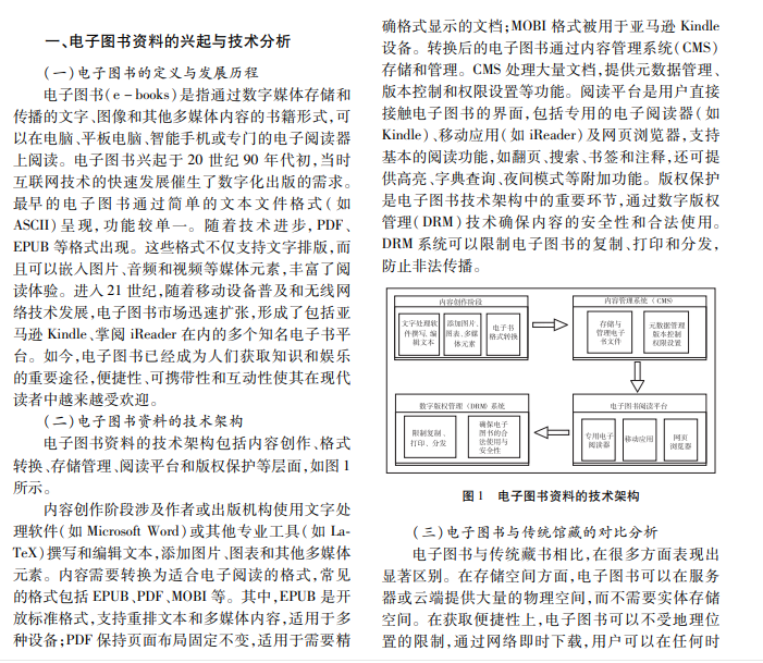 随着信息技术飞速发展,电子图书以便捷的获取方式和多样化的管理模式,挑战传统图书馆的馆 藏管理和服务体系。本文分析电子图书的定义、技术架构及其对传统馆藏的影响及冲击,探讨传统图书馆面临 的挑战,提出电子图书与传统馆藏融合的策略,以期为图书馆的数字化转型提供技术参考。