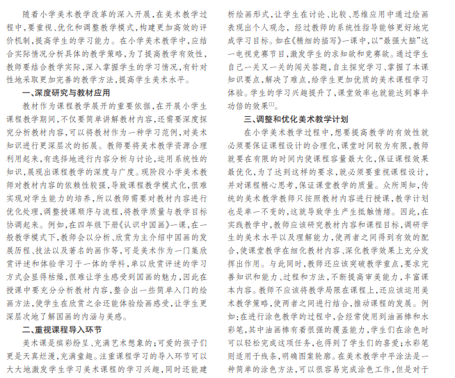 在小学美术教学课堂中,教师要重视提高美术教学质量,要有针对性地采取更加高效的教学模式,以激发 学生的学习兴趣,为学生学习能力提高奠定基础。本文结合教学实际,分析了小学美术教学有效性的策略,旨在通过实 践探索,为学生日后发展助力。
