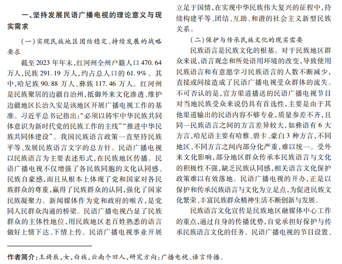 民语广播电视是民族群众获取信息的重要渠道,在加强地区民族团结、带动民族地区社会经济发 展、联系跨境邻邦等方面具有不可估量的作用,是推进中华民族共同体建设进程中讲好中国故事的关键一环。 本文从中华民族共同体视阈出发,通过分析红河州民语广播电视的传播路径与传播内容,思考民语广播电视的 价值体现和发展策略。