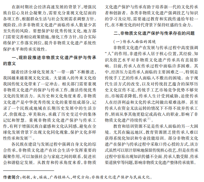 非物质文化遗产是中华优秀传统文化的重要组成部分,扎实做好非物质文化遗产保护和传承工 作,对增强文化自信、促进文化强国建设具有重要意义。本文就非物质文化遗产保护及传承两方面展开研究, 强调非物质文化遗产必须得到有效保护,以适应现代社会发展。