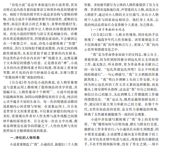 《百合花》是茹志鹃于 1958年创作的一篇短篇小说,也是一篇典型的“诗化小说”。诗性语言的运 用使小说在人物形象塑造及意象表达方面极其出色,既有实感、美感,又歌颂战争年代闪耀的人性美。