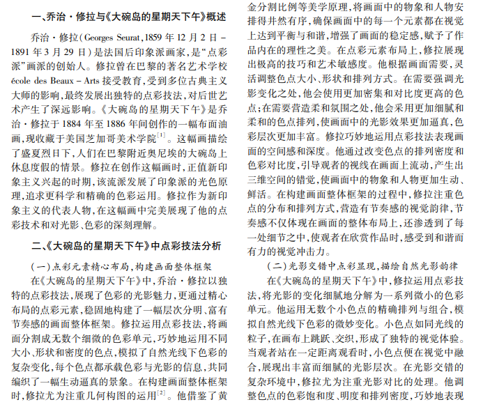 乔治·修拉的《大碗岛的星期天下午》是新印象主义的代表作,其独特的点彩技法和深刻的印象派 美学思想,对后世艺术产生了深远影响。本文基于乔治·修拉的《大碗岛的星期天下午》,分析作品点彩技法, 探讨印象派美学在其中的体现与拓展,为理解作品的艺术价值提供新的视角。