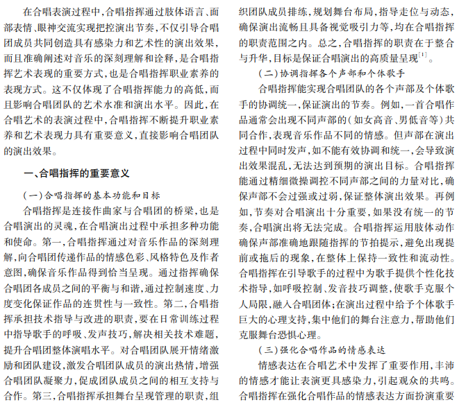 在合唱艺术表演中,合唱指挥是合唱团队的灵魂。合唱指挥通过面部表情和肢体动作表达对音乐 作品的理解,把控合唱团队的表演节奏,调动合唱演员的演出情绪。本文探讨合唱指挥艺术表现力的内涵,研 究提升合唱指挥艺术表现力的有效策略。