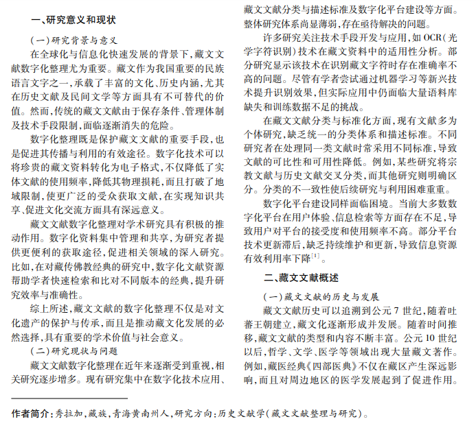 互联网发展为藏文文献数字化整理带来机遇与挑战,其在保护传承藏文化、提升藏文化影响力方 面发挥重要作用。本文通过分析藏文文献数字化整理面临的技术人员短缺、资金不足、法律法规不完善等挑 战,提出加强跨学科合作、寻求社会支持、建立法律框架等解决方案,以实现藏文文献有效保护利用,促进藏文 化传播发展。