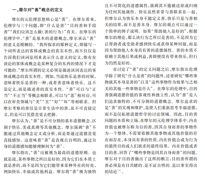 20世纪,英国哲学家摩尔以独特的道德认识论重新定义了伦理学核心问题,其对“善”概念的阐释, 引发了广泛讨论。本文分析摩尔“善”的概念及其哲学内涵,探讨其在当代伦理学尤其元伦理学中的地位和影 响。通过深入研究摩尔主义思想,揭示其对“善”的独特见解及其在当代伦理学的重要贡献和争议。