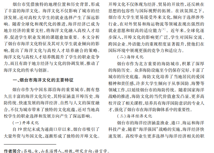本文探讨了烟台市海洋文化的四大特征,分析其对大学生职业选择、创业意愿、就业观念国际化的 影响。通过分析烟台市高校大学生的就业现状,本文提出提高海洋文化与高校人才培养融合度的策略等,以此 激发创新精神和国际视野,推动人才培养与地方海洋经济的融合。