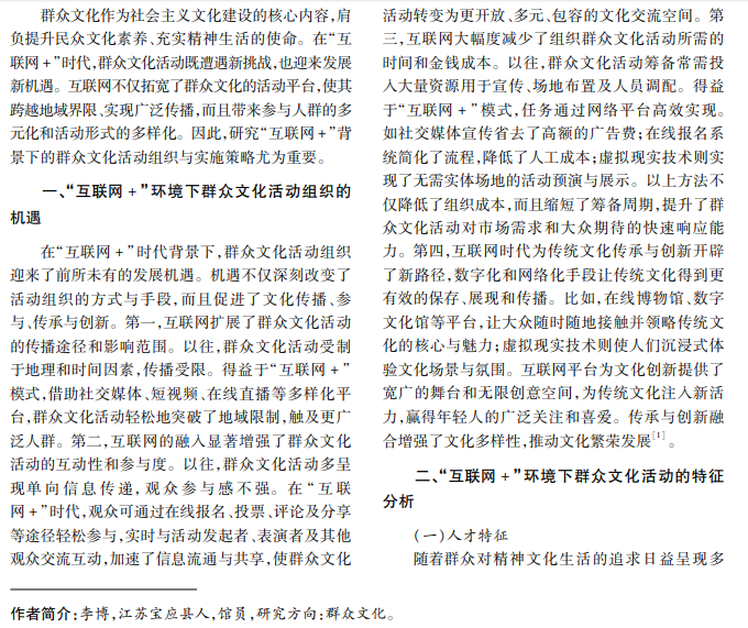信息技术的飞速发展使互联网全面渗透人们的日常生活,改变了人们的生活模式。互联网不仅 对经济、教育、医疗等领域产生深刻影响,更为文化领域注入了新的发展活力。“互联网 +”概念因此兴起,成 为新时代发展的重要趋势之一。本文重点研究在“互联网 +”背景下,如何有效组织和推进群众文化活动的 发展策略。