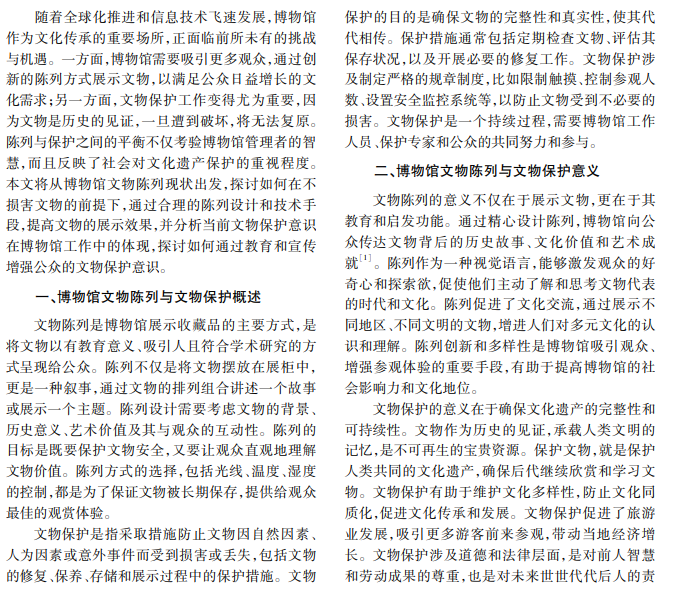 在历史长河中,博物馆作为文化传承的载体,扮演至关重要的角色。博物馆不仅保存人类文明的 宝贵遗产,更是连接过去与未来的桥梁。本文探讨博物馆文物陈列与文物保护意识的关系,分析当前博物馆在 文物展示中采取的保护措施,希望珍贵的文化遗产得到更好的保存和传承。