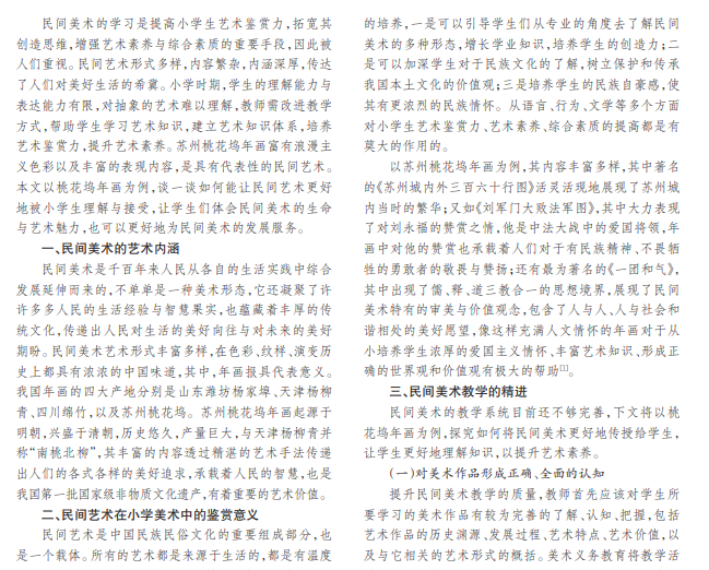 随着人民生活水平的日益提高,国民对艺术的鉴赏力也在不断提高。民间美术作为反映人民实际生活与 精神世界的一面镜子,贯穿于我们整个生活。民间美术形式丰富多样,本文以苏州桃花坞年画为例,分析新视野中的民 间美术教学。