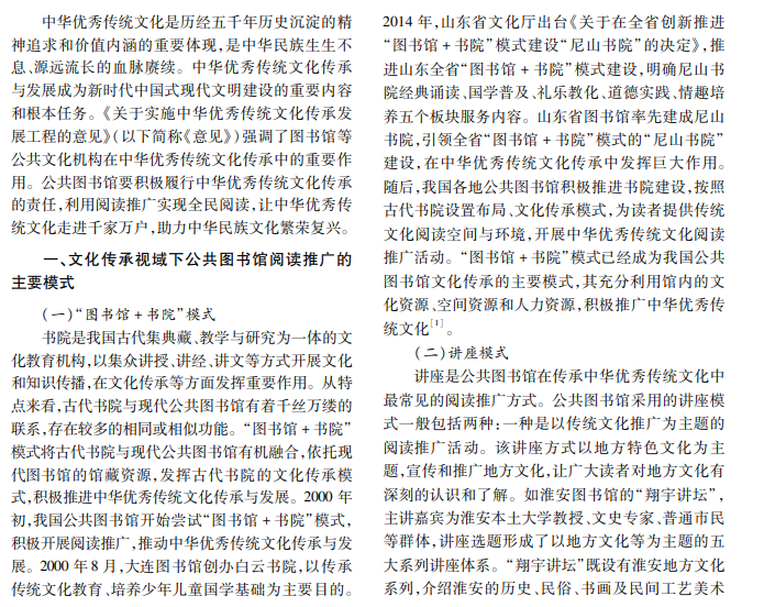 公共图书馆是传承中华优秀传统文化的主阵地,阅读推广是公共图书馆传承中华优秀传统文化的 关键举措。目前,在文化传承视域下,公共图书馆阅读推广模式主要包括“图书馆 +书院”、讲座和文旅融合。 本文分析公共图书馆阅读推广面临的主要挑战,提出文化传承视域下公共图书馆阅读推广的策略。