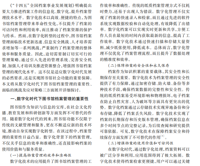 图书馆档案管理作为知识传承与信息共享的重要环节,其数字化转型对提升管理效率、保障信息 安全、促进知识共享具有重大意义。本文阐述数字化技术的重要性,分析数字化技术应用的主要问题,提出建 立先进管理系统、完善安全防护机制、加强人才培养、推进资源整合等策略,以提升管理效率和信息安全,促进 知识共享与有效传播。