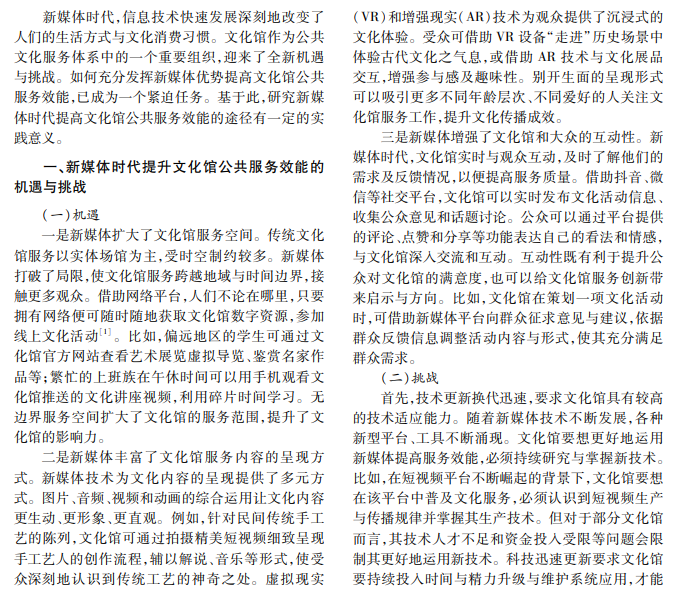 新媒体平台丰富多样,为文化馆提供了更多的服务渠道。文化馆可以通过新媒体平台发布文化活 动信息、展示文化作品、开展线上互动等,让更多人了解和参与活动。基于此,本文分析新媒体为文化馆服务带 来的机遇与挑战,深入探讨提升文化馆公共服务效能的策略。