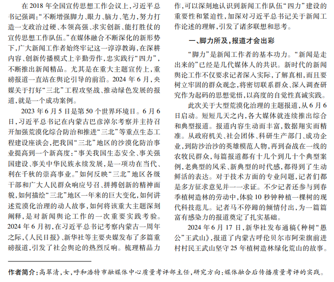 本文以 2024年 6月央媒报道“三北”治沙为案例,阐释习近平总书记对广大新闻工作者提出增强 “四力”要求的内涵和意义,从脚力的勤奋、眼力的锐利、脑力的深邃、笔力的雄健四个层次说明一档新闻精品产 生流程;在充分论证基础上,提出“四力”是一个有机联系、互相促进的整体。融媒体时代,新闻从业人员提升 “四力”,需要长期刻苦学习和历练、与时俱进,不断更新、汲取新思想。