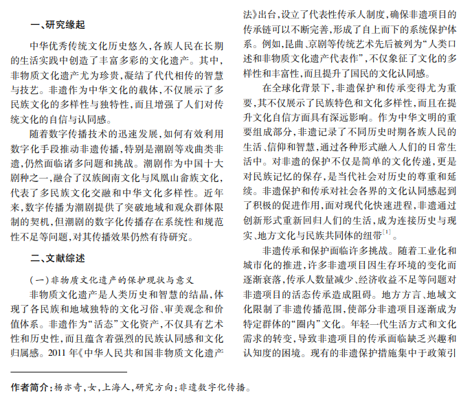 本研究以潮剧为例,探讨非物质文化遗产的数字化传承与传播。潮剧是汉族闽南文化与畲族文化 融合的艺术结晶,具有重要的地域价值与文化价值。本文采取问卷调查法,分析潮剧在年轻人中的认知度与参 与偏好,从传播策略和观众互动角度提出数字化创新建议,提升潮剧的文化影响力和公众参与度,为非遗的数 字化保护提供新思路。