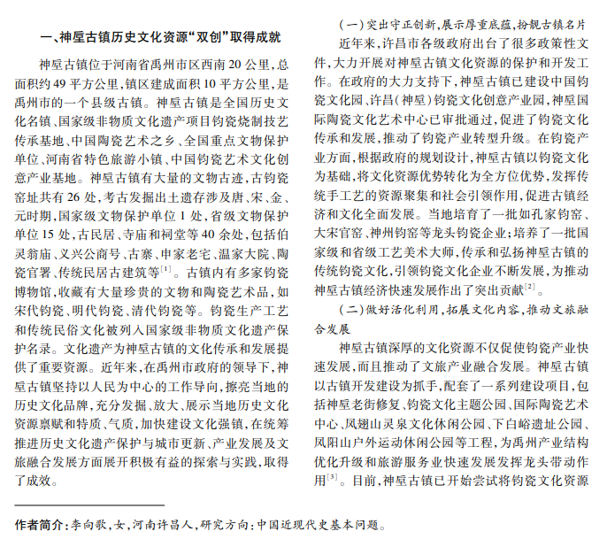 神垕古镇文化资源丰富,“双创”环境优良,在保护和开发文化资源方面取得了成就,但其发展过程 中仍然存在问题。在“双创”背景下,神垕古镇要坚持以市场为导向,以创新为动力,以产业发展为目标,通过深 挖文化资源内涵、打造品牌形象等方式,提高文化资源的利用效率和开发价值,让文化资源“活起来”“走出去”。