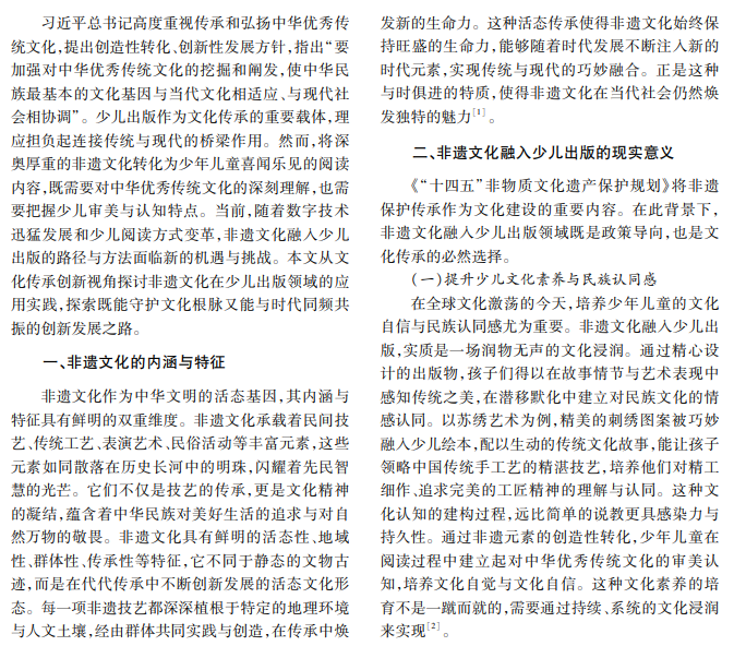 非物质文化遗产在少儿出版领域的创新应用既是传承的需要,也是时代的召唤。本文以非遗文化 融入少儿出版实践为研究对象,探讨当前存在的困境与挑战,并从创新内容呈现等维度提出对策建议,以期实 现非遗文化的活态传承,为少儿出版开拓新天地。