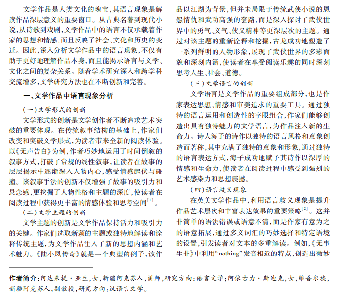 基于跨学科视角、数据技术辅助、理论方法创新等文学研究方法的最新进展,本文分析上述方法如 何为文学研究带来新的视角和洞见,探讨文学作品中丰富多彩的语言现象及其背后深层含义,关注文学研究方 法的创新趋势。研究得出,深入理解语言现象和不断创新研究方法是推动文学研究发展的关键。