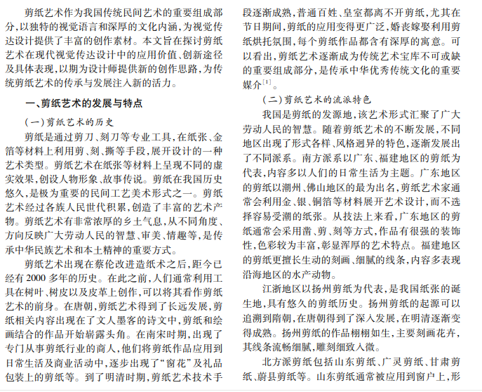 随着时代发展,视觉传达设计工作应得到逐步优化,设计人员要积极引入新的设计理念、设计方 法,提升视觉传达设计工作效果。剪纸作为我国的艺术瑰宝,将其应用到视觉传达设计,丰富了视觉传达设计 内容,拓宽视觉传达设计路径。本文探讨剪纸艺术在视觉传达设计中的创新应用。