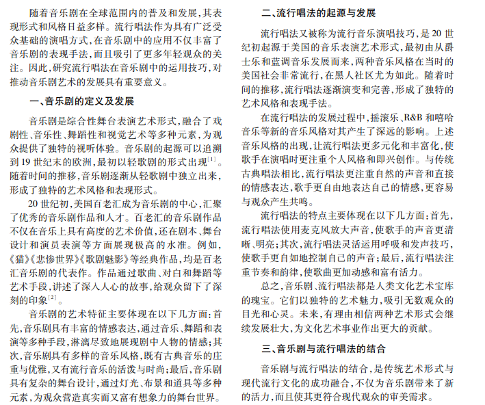 音乐剧是综合艺术形式,融合了戏剧、音乐和舞蹈等多种元素。流行唱法因自然、贴近生活的特 点,逐渐被广泛应用于现代音乐剧。本文分析流行唱法的声音运用、情感表达等内容,探讨其在音乐剧中的应 用技巧,为音乐剧演唱者提供参考和借鉴。