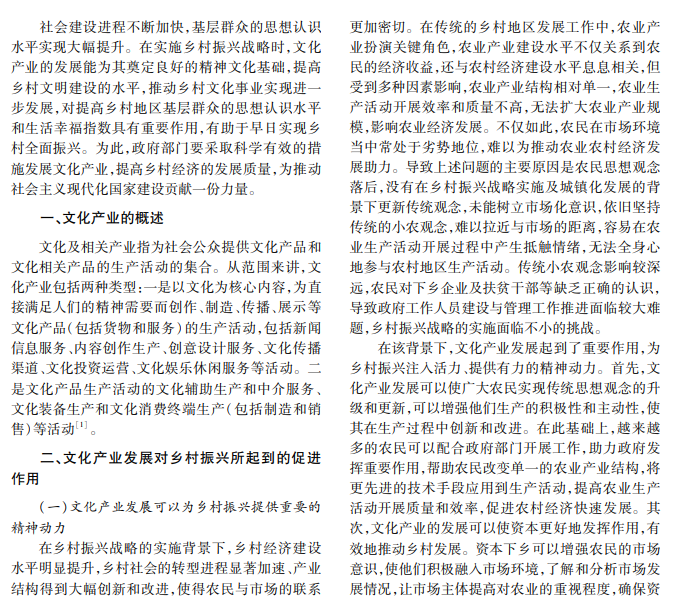 如今,基层民众生活条件明显改善,农业农村经济建设水平实现了大幅提升,但要使乡村地区实现 高质量发展,不仅要加大对乡村经济的建设力度,更要提高对文化产业的重视程度,通过推动文化产业发展赋 能乡村振兴。本文围绕发展文化产业、赋能乡村振兴展开分析和论述,希望提供有效的参考和帮助。