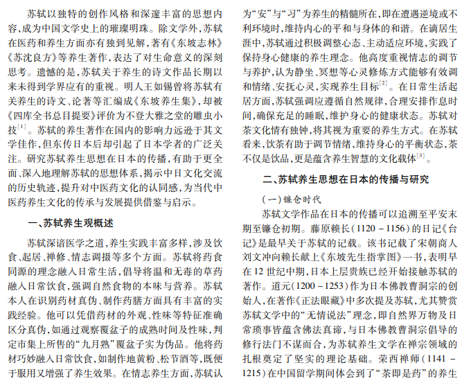 苏轼的诗文在日本传播历史久远,通过佛教僧侣和文人医者等途径传播,被日本文化阶层广泛接 受。苏轼著作的养生思想涉及药食同源、情志调摄等多个方面。本文梳理苏轼养生作品在日本镰仓时代到江 户时代的传播历程,分析其对日本禅宗、茶文化、文学创作等领域的影响;从文学、医学、养生等角度梳理日本学 者对苏轼养生文学和思想的引用与借鉴,分析苏轼养生文学在日本传播的成功案例。