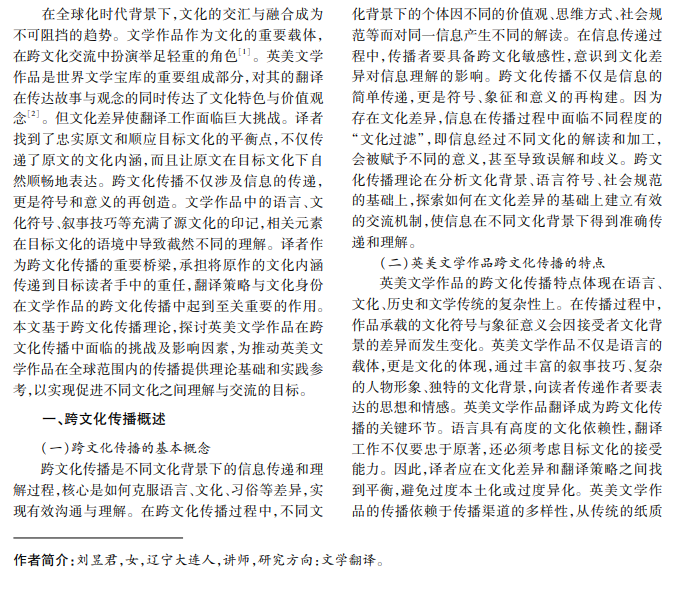 在全球化背景下,英美文学作品的跨文化传播成为连接不同文化的重要纽带。本文通过探讨英美 文学作品在跨文化传播中的特点和影响因素,分析政治与社会背景、译者的文化身份、读者的接受度与文化适 应性等因素对跨文化传播的影响,提出优化英美文学作品跨文化传播的策略,提升译者的文化敏感度、翻译与 本地化结合的传播方法、利用新媒体提升传播影响力,以实现更广泛而有效的文化交流与传播。