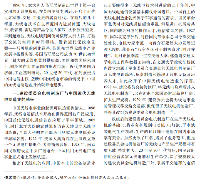 无线电工业是现代电子工业的一个门类,20世纪 20年代开始在中国兴起。本文通过资料整理,概 述 1927年至 1949年间中国近代无线电制造业早期发展路径。