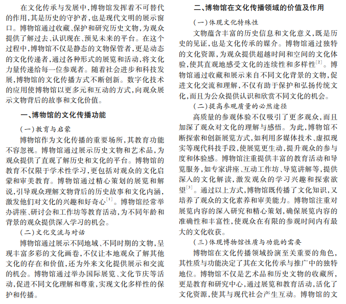 在全球化和信息化背景下,博物馆作为文化传播的重要平台,其价值和作用日益受到重视。博物 馆不仅承载历史的印记,更是连接过去与未来的桥梁。本文旨在探讨博物馆在文化传播领域的价值和作用,分 析其在现代社会中的角色转变,探讨如何创新提升博物馆文化传播效率和影响力。