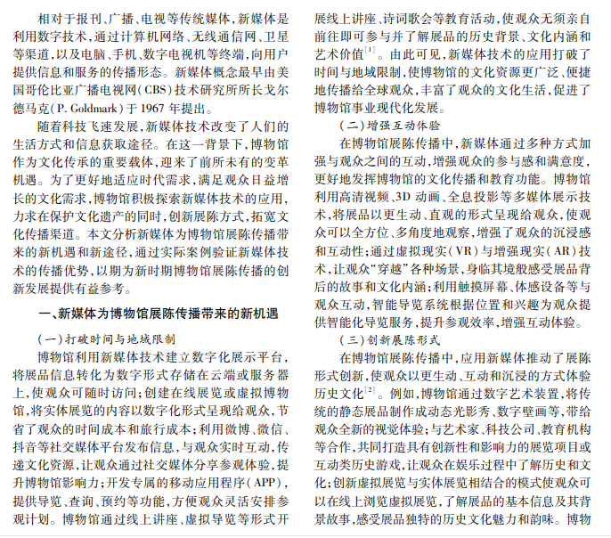 新媒体技术在博物馆展陈中的应用打破了时间与地域限制,增强了互动体验,丰富了展陈形式与 内容。本文结合宁夏博物馆的新媒体展示环境,探讨新媒体在博物馆展陈传播中的有效性和潜力,为博物馆传 统文化实现现代化传播提供参考,通过实际案例分析新媒体技术为博物馆展陈传播带来的新机遇和新途径。
