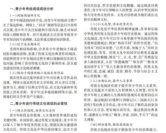 阅读对青少年成长的重要性不言而喻。目前,青少年面临电子媒体和网络娱乐的干扰,传统文化 阅读逐渐被忽视。公共图书馆是文化传承和知识普及的重要场所,开展青少年传统文化阅读推广,对提升图书 馆的社会影响力和服务质量具有重要意义。本文对梅州市梅县区图书馆推广传统文化的阅读途径展开研究。