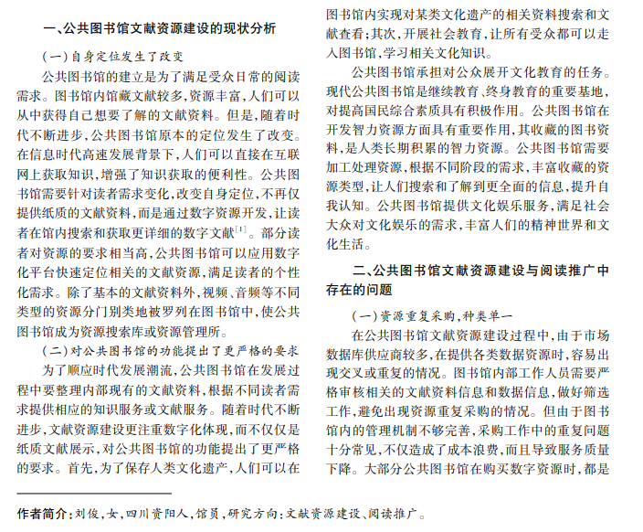 新时代,人们知识需求面扩大,基于互联网,可以收集和查阅不同类型的文献资料,提升自我认知, 解决信息不对称等问题,纸质阅读不再是获得知识的主要途径,越来越多的人开始利用移动智能设备实现数字 阅读。公共图书馆文献资源管理明显受到这种新发展趋势的影响,亟须建立数字文献资源管理库,提供数字阅 读服务,以满足新时代阅读需求。