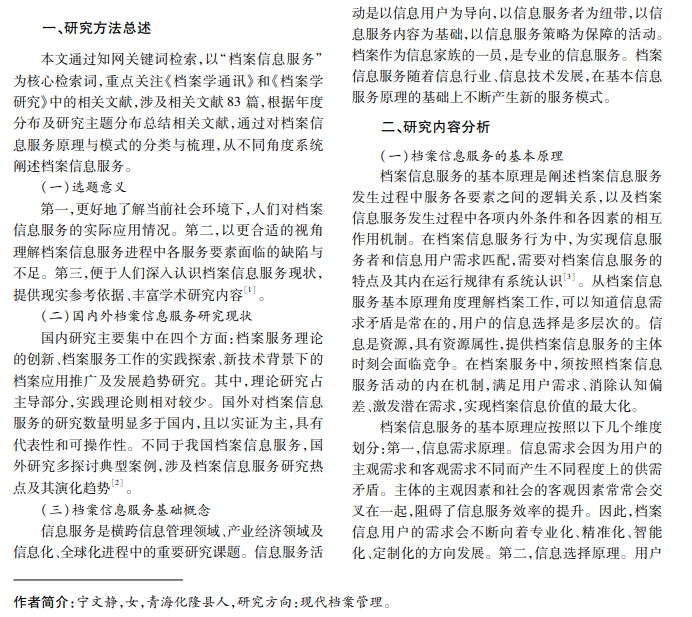 本文通过知网关键词检索,以“档案信息服务”为核心词检索近十年来的相关文献,通过对文献主 题梳理与分类,从档案信息服务的基本原理、构成要素、服务模式、服务理念演变及当前我国档案信息服务能力 建设现状等研究主题出发,对档案信息服务展开理论探讨,结合网络环境下的信息服务背景,阐述实践过程中 我国档案信息服务研究的时代特征与发展趋势。