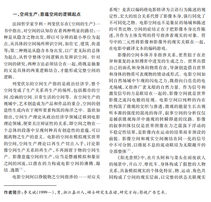 在对意蕴空间的推论中,影像空间与现实空间的碰撞孕育了连续和分离两重向度。连续性立场 中,影像空间以日常的复归形成意蕴的隐匿式生成;分离性立场中,影像空间以情境的断裂形成意蕴的强度式 增殖。意蕴在连续与断裂、身体与心灵、主体性与物质性中构造无限缠结的空间整体,在对立共生中重现创生 性的微观海洋本源。